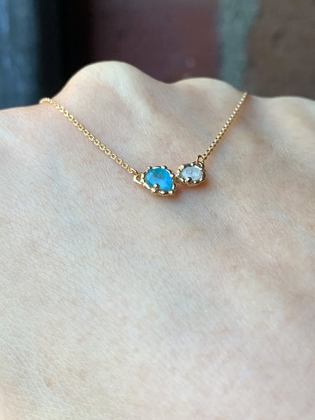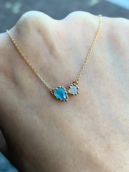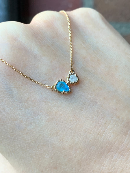 ネオンカラーとうっすら紫色がのぞく美しいパライバトルマリンと、キラキラのミルキーダイヤのペアです。